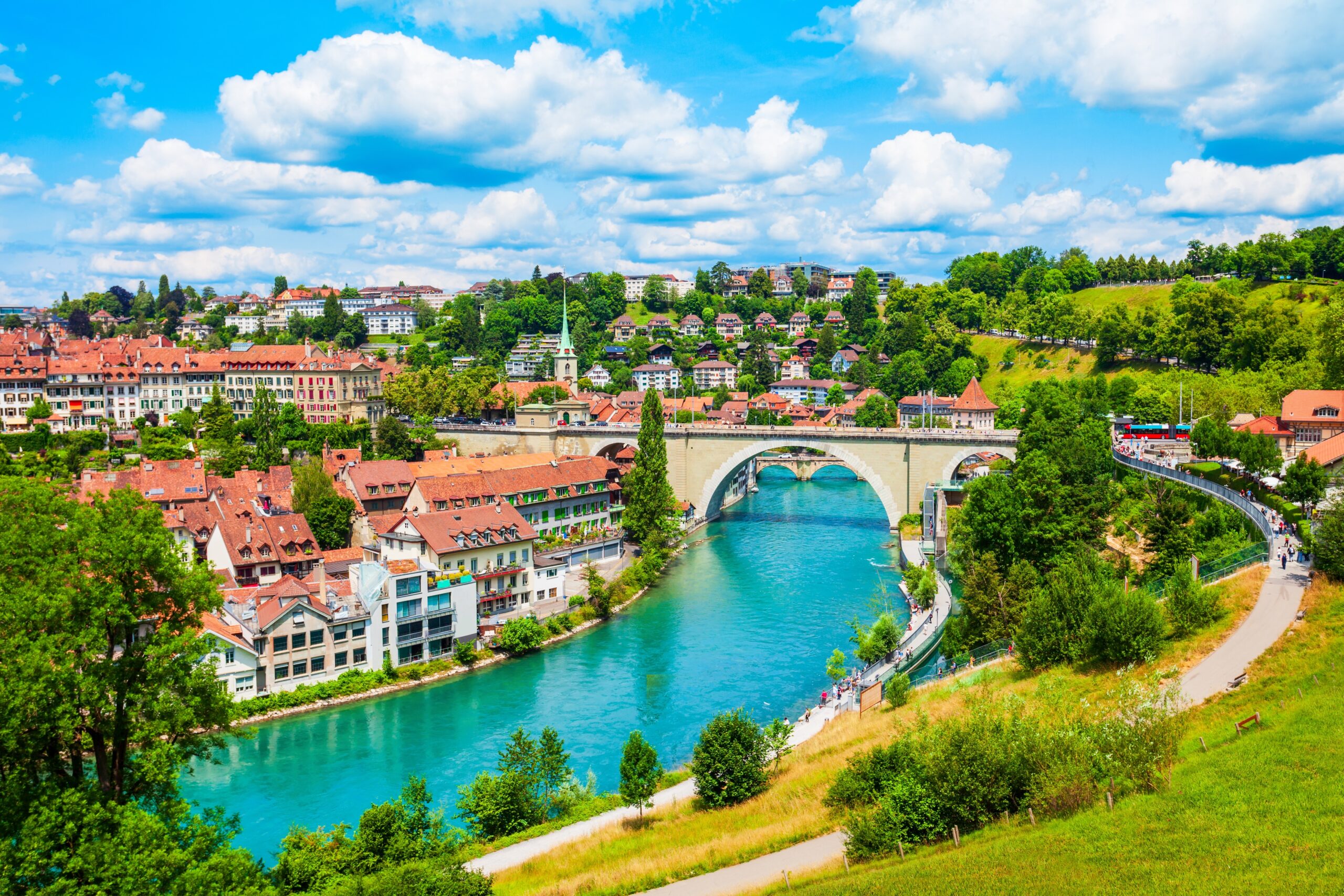 Heute folgen wir der Aare weiter in Richtung Norden. Spiez, idyllisch am See gelegen, lädt mit gleich drei Museen und dem historischen Schloss zu einem kurzen Zwischenstopp ein. Durch das Berner Oberland radeln wir weiter über Allmendingen nach Thun, wo uns eine malerische Altstadt mit mediterranem Flair empfängt. Ab hier treten die schneebedeckten Gipfel langsam zurück – wir erreichen das Schweizer Mittelland. In der Bundesstadt Bern unternehmen wir eine Stadtführung, bei der wir unter anderem den Zytglogge, das Bundeshaus, das Münster und den berühmten Bärengraben entdecken. Anschließend bringt uns der Bus zurück ins Hotel.